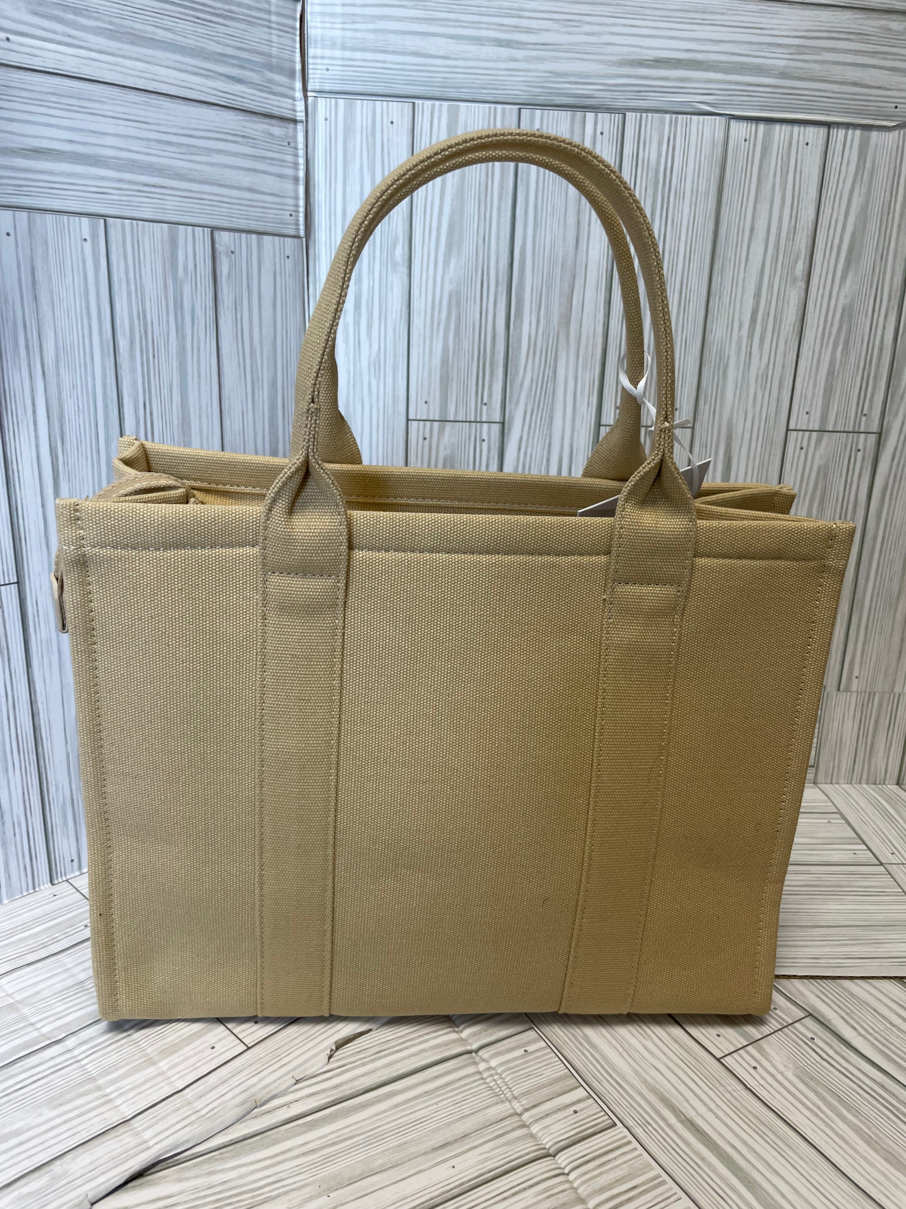 The tote bag is in Canvas material. A lighter weight bag to carry. Does come with a strap option Has a Zipper compartment inside and two pockets on the inside. There is a zipper closure.
